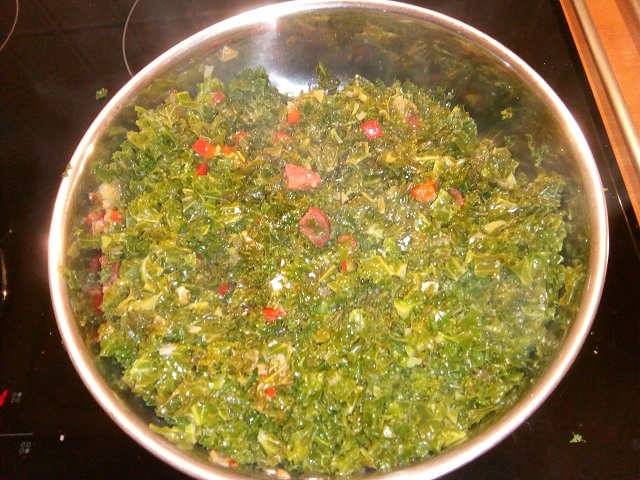 Verhit de o0lijfolie in een ruime koekenpan en fruit daarin de ui en blokjes chorizo. Voeg dan de paprika toe en bak deze een paar minuten mee. Voeg de boerenkool toe met twee kopjes water. -