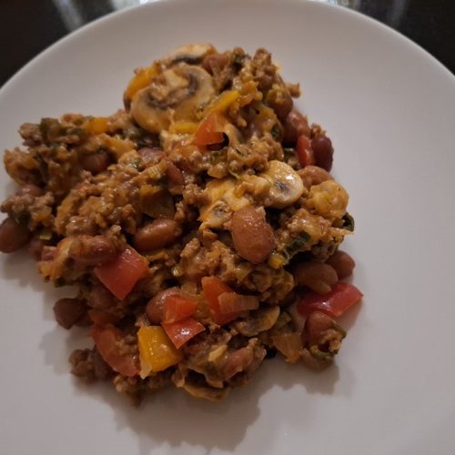Bruine Bonen Schotel met Paprika, Prei, Champignons, Gehakt en Kaas