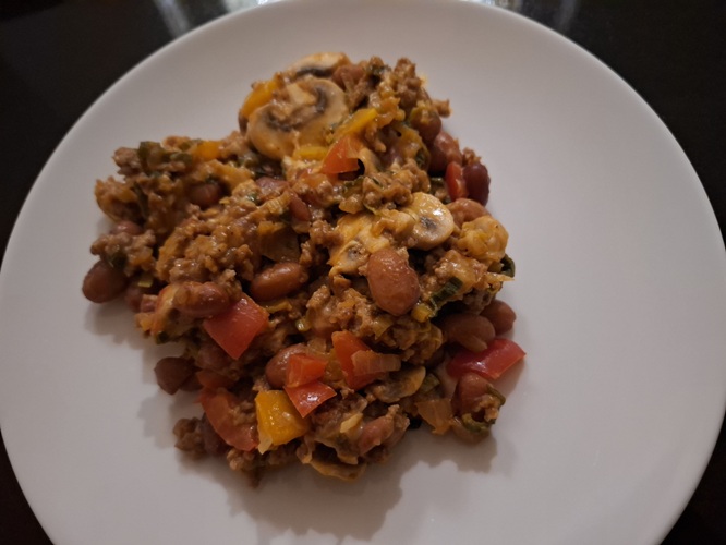 Keyword: Bruine Bonen, Champignons, Gehakt, Kaas, Paprika, Prei