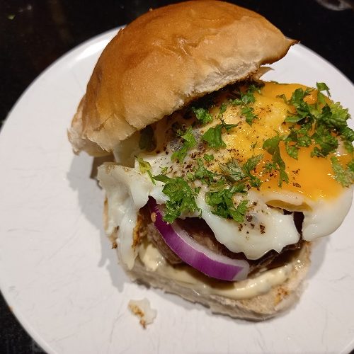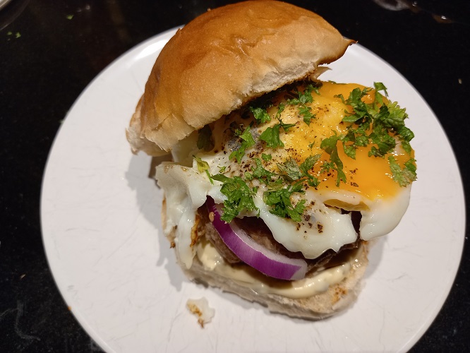 Bak in een koekenpan met een beetje olie 2 spiegeleitjes. Leg de burgers op de bolletjes met mayonnaise.