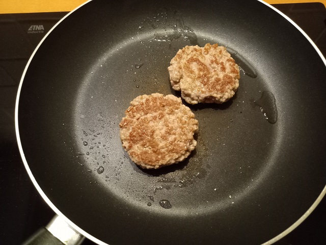 Maak van het gehakt 2 burgers. Verhit 1 el. olie in een koekenpan en bak de burgers mooi bruin. Bestrooi beide kanten tijdens het bakken met wat zout en peper.