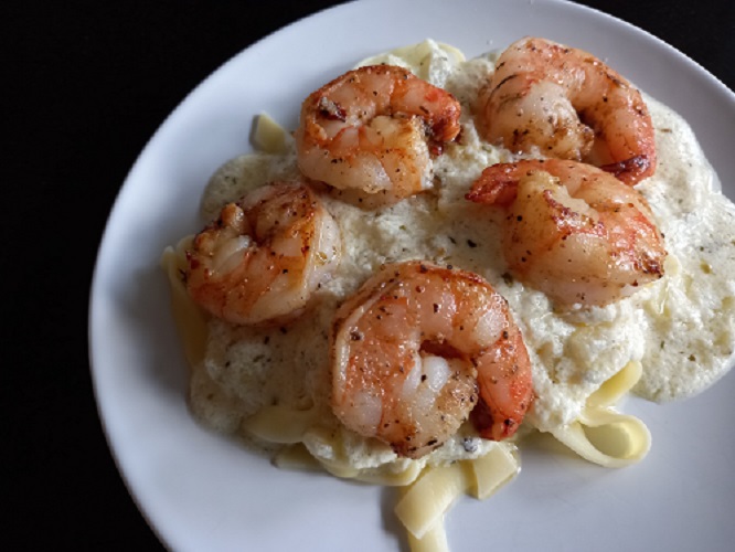 Verdeel de tagliatelle over de borden. Schep hierover de saus en verdeel hierover de garnalen.