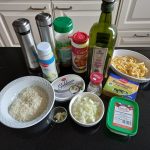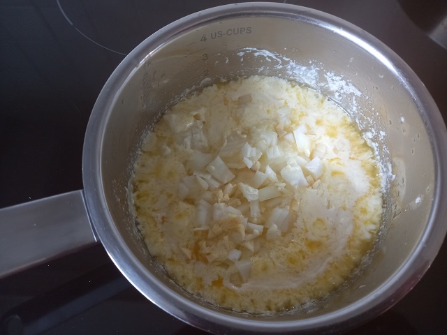 Verwarm in een ruime steelpan de boter en de roomkaas. Zodra de boter en kaas gesmolten zijn voeg dan de ui en de knoflook toe.
