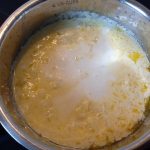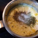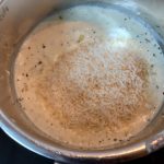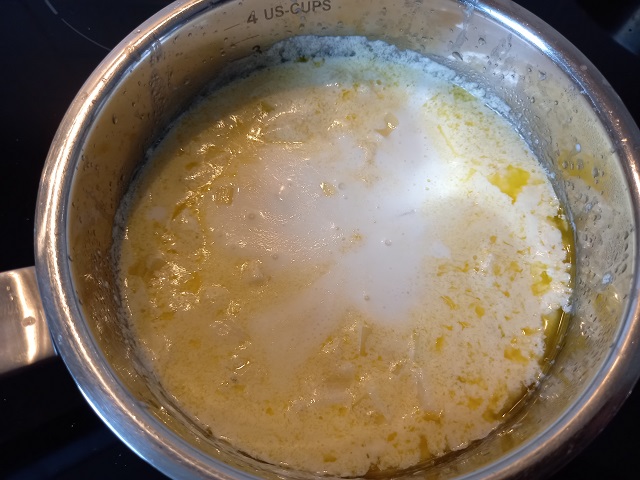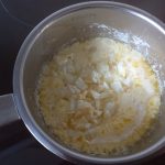 Zodra de ui wat zachter is voeg dan de kookroom toe. Roer goed door elkaar. Breng zachtjes aan de kook.