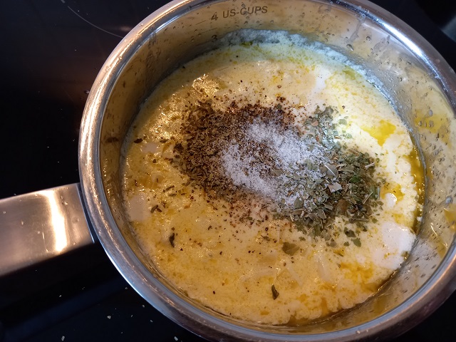 Voeg de oregano, basilicum, zout en peper toe. Meng het geheel goed door elkaar.