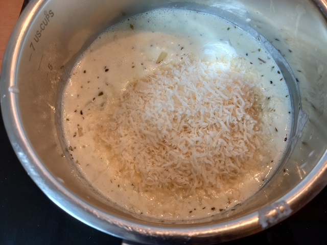 Strooi er de Parmezaanse kaas over en kook zachtjes tot de kaas gesmolten is en het geheel wat dikker is geworden.