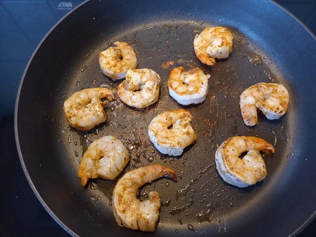 Verhit een koekenpan met de olie en bak de garnalen gedurende 2 à 3 minuten aan één kant keer ze daarna om en bak de andere kant.