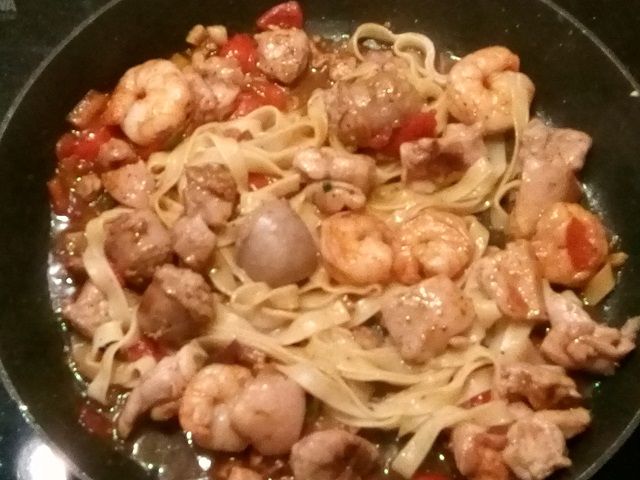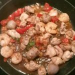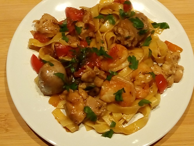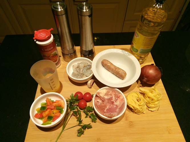 Zet alle ingrediënten klaar. Maak de garnalen schoon en verwijder het darmkanaaltje. Pel en snipper de ui en de knoflook. Snijd de paprika in blokjes. Snijd de kip in blokjes van ongeveer 2 cm. Snijd de saucijs in stukjes van 2 cm.