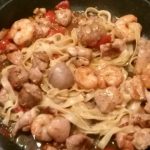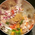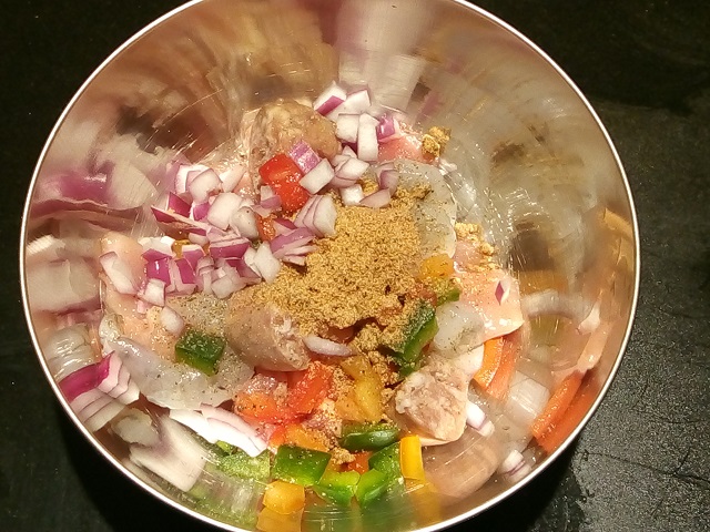 Meng in een kom de kip, garnalen, worst, Cajunkruiden, paprikablokjes, de ui, knoflook en wat zout en peper.
