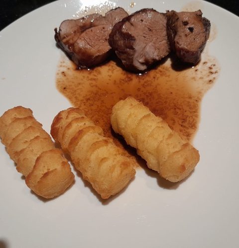 Verhit in een hapjespan de olie en fruit de ui tot deze glazig is. Voeg dan de kipblokjes toe en bak deze aan alle kanten gedurende 5 à 6 minuten aan.