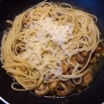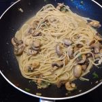 Kook intussen de spaghetti volgens aanwijzingen op de verpakking. Giet de pasta af maar bewaar een kopje van het kookvocht.