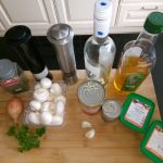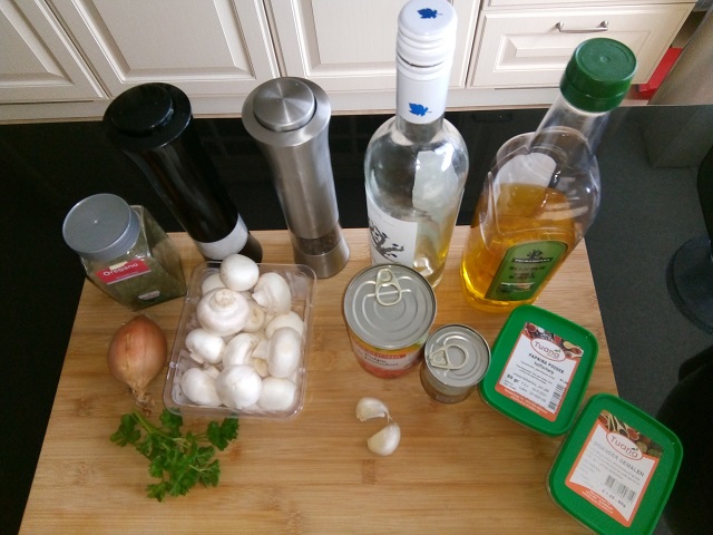 Zet alle ingrediënten klaar. Pel en snipper de ui en de knoflook. Veeg met een stukje keukenpapier de champignons schoon. Snijd het harde steeltje eraf. Snijd de champignons in vieren of zessen, afhankelijk van de grote.