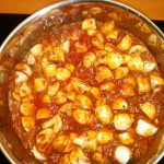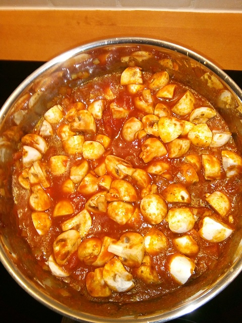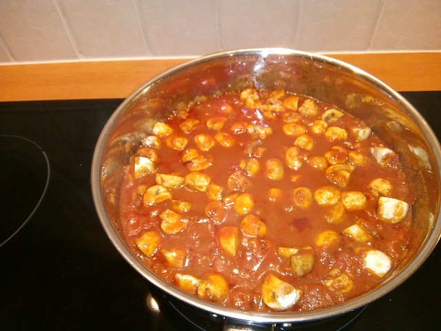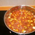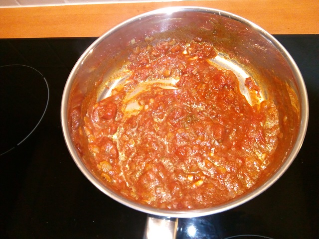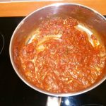 Haal de pan van het deksel en laat inkoken tot de door jou gewenste dikte. Tijd kan ik hier niet voor geven want dat is afhankelijk hoeveel vocht er uit het blik tomatenblokjes kwam. Proef en breng op smaak indien nodig met wat zout en peper. Is het wat aan de zure kant voeg dan wat suiker toe.