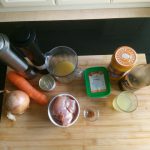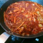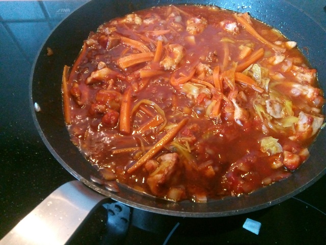 Voeg dan de ui toe met de tomatenpuree. Voeg de rest van de ingrediënten toe en laat wat inkoken.