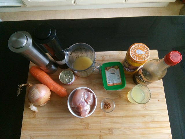 Zet alle ingrediënten klaar. Snijd de kippendijfilet in blokjes. Snipper de ui. Schil de wortel en snijd julienne. Kook de rijst volgens aanwijzingen op de verpakking.