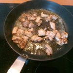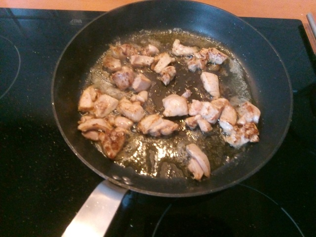 Verwarm de boter in een koekenpan en bak de kipblokjes rondom bruin.
