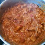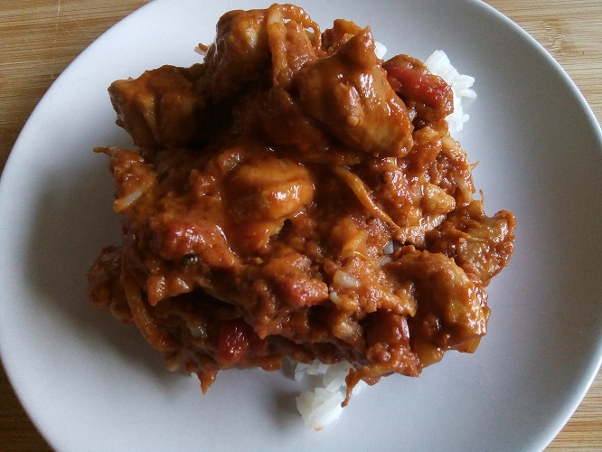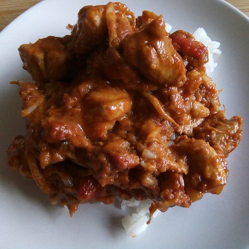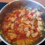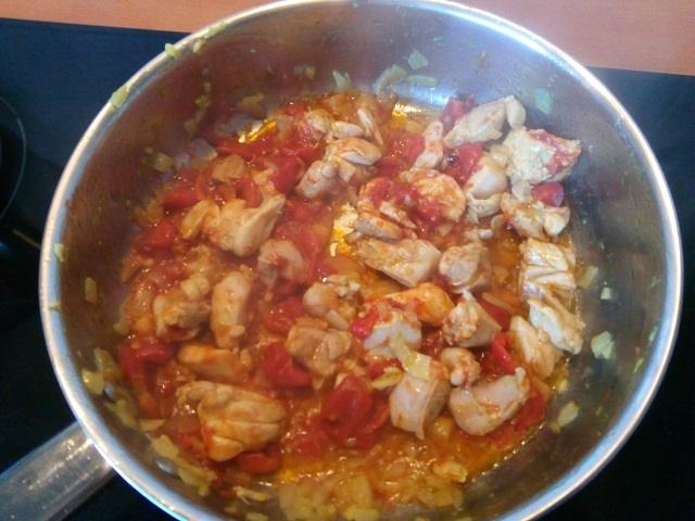 Voeg de blokjes kip toe en bak deze rondom aan. Voeg dan de tomatenpuree en de paprikablokjes toe. Breng op smaak met de chilipoeder, peper en zout.