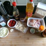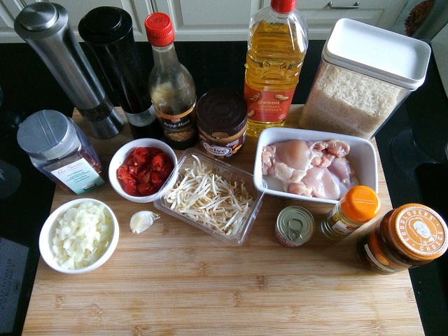Zet alle ingrediënten klaar. Pel en snipper de ui en de knoflook. Maal de chilivlokken fijn in een vijzel. Snijd de kippendij in stukjes. Snijd de paprika in blokjes.