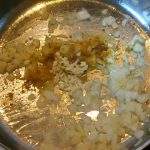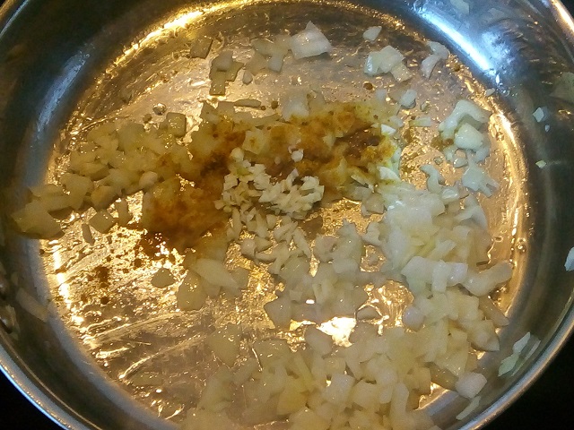 Verhit 2 el olie in een hapjespan op middelhoog vuur. Fruit de ui glazig. Zodra deze glazig is voeg dan de knoflook en de kerriepoeder toe.