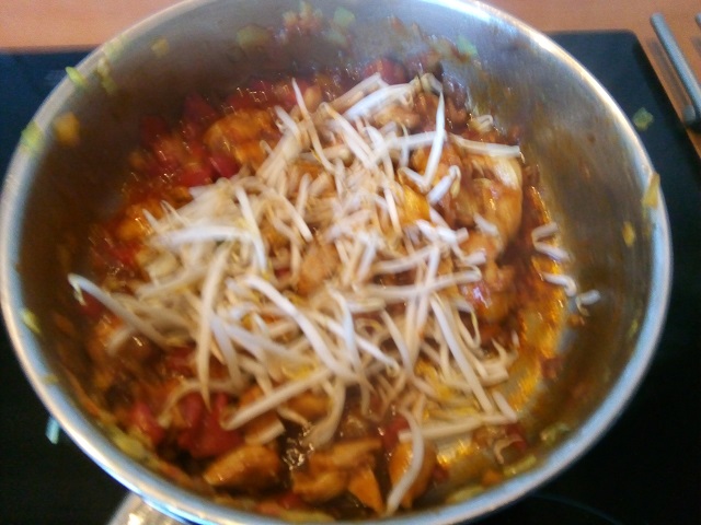 Voeg de taugé en de ketjap toe en roer goed door elkaar.