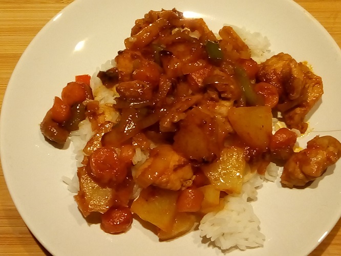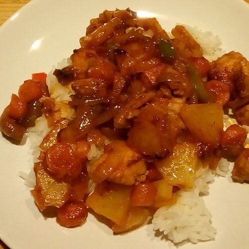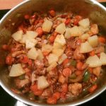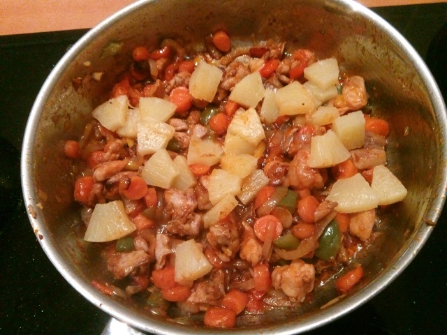 Proef en voeg eventueel wat suiker toe. Voeg de wijnazijn en een eetlepel van het ananassap toe en roer dit goed door elkaar. Voeg als laatste de ananas stukjes toe en laat deze even mee warmen.