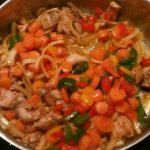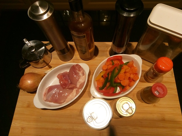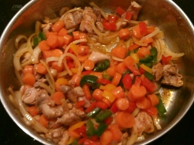 Zet alle ingrediënten klaar. Pel de ui en snijd deze in halve ringen. Pel en snipper de knoflook. Snijd de kip in blokjes. Snijd de wortel en de paprika in blokjes.