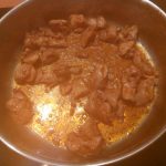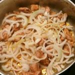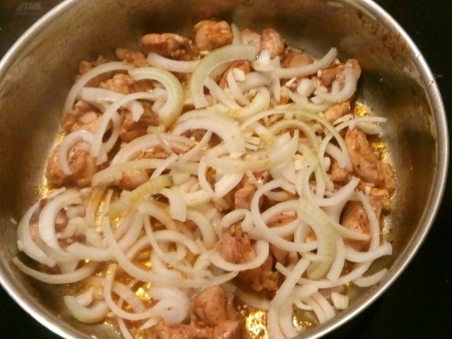 Voeg de ui-ringen en de knoflook toe en laat even mee fruiten. Snij intussen de ananasringen in stukjes.