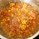 3. Verhit de olie in een hapjespan en fruit hierin de ui. Zodra deze glazig is voeg dan de paprika en wortel toe. Bak dit gedurende een minuut of 5. Voeg nu het gehakt toe en bak deze rul. Voeg nu de kruidenmix toe. Voeg de mais toe. Roer goed door elkaar. Voeg nu de gepelde tomaten uit blik toe en druk deze met behulp van een pollepel in stukjes. Voeg nu de bonen toe en laat nog een half uurtje stoven.