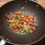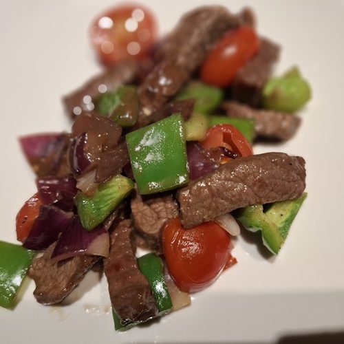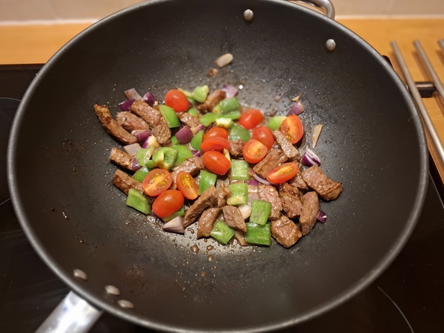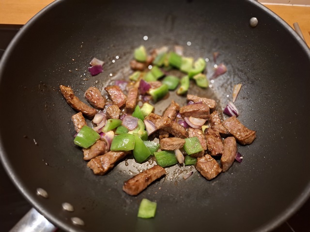Verhit 1 el. olie in een wok of ruime koekenpan op middelhoog vuur. Bak de vleesreepjes aan alle kanten zo'n 3 minuten. Maak je grotere hoeveelheid van dit recept bak het dan in batches. Gebruik dan meer olie als dat nodig is. Voeg de ui en paprika toe totdat de ui zacht begint te worden. Ongeveer 2 minuten.