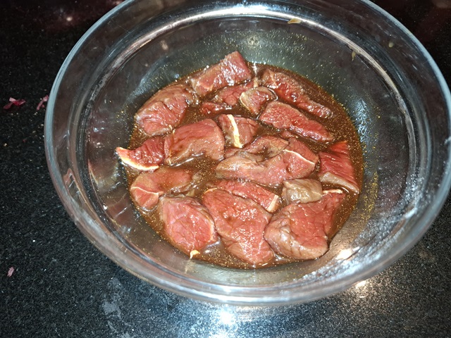 Voeg de reepjes vlees toe en meng door elkaar zodat alle kanten van het vlees bedekt zijn met de marinade.