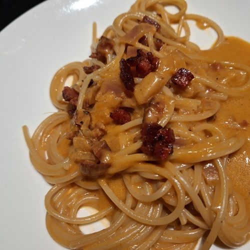 Spaghetti gekookt in een simpele romige, knoflook, Parmezaan saus, afgetopt me knapperige chorizo stukjes. Lekker eenpansgerecht.