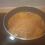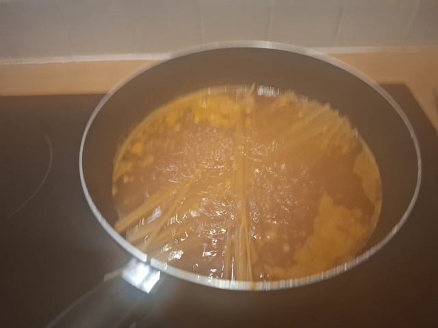 Doe de deksel op de pan en kook volgens de tijd die op de verpakking van de spaghetti staat aangegeven. Haal dan de deksel van de pan en proef of de spaghetti gaar is.