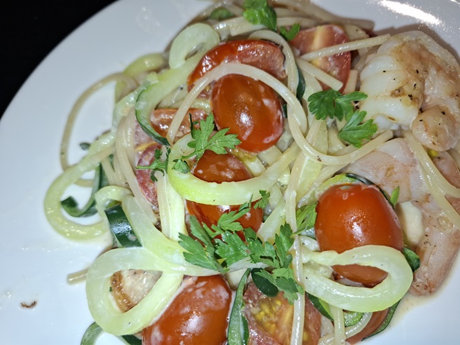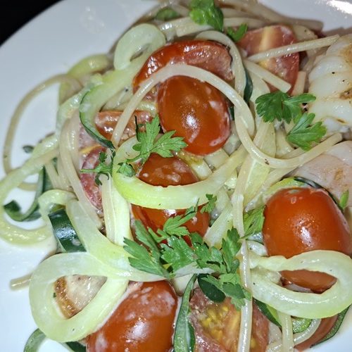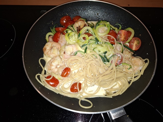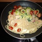 Voeg de tomaten toe en bestrooi met wat zout en peper. Voeg de courgettini en de spaghetti toe samen met de kookroom. Roer goed door elkaar en laat even doorwarmen.