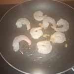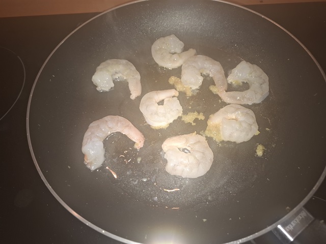 Verhit ondertussen de olie in een koekenpan en bak de garnalen aan beide kanten met de knoflook. Voeg de witte wijn toe en laat een minuutje koken.
