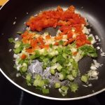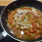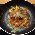 Voeg de tomatenblokjes, de kruidnagel, laurier, peterselie en de Cayennepeper toe. Voeg ook een beetje zout toe. Roer goed door elkaar.