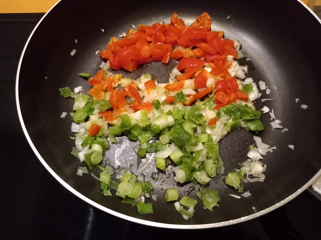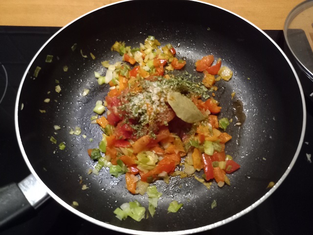 Verhit 1 el. olie in een hapjespan en fruit de ui, paprika en selderij gedurende 5 minuten. Roer regelmatig door.