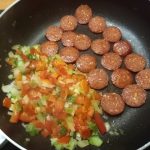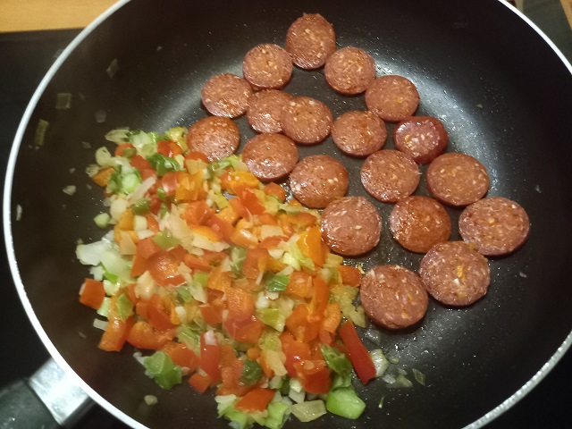 Schuif de groenten naar 1 zijde en voeg de chorizo toe op de lege plek. Bak gedurende 2 minuten. Haal de chorizo uit de pan en bewaar op een bordje.