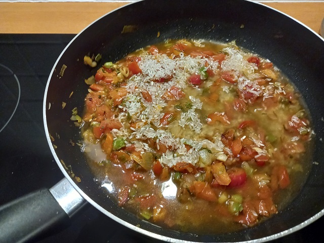 Zet de warmtebron iets hoger. Voeg de kippenbouillon toe. Zodra deze zachtjes begint te pruttelen voeg dan de rijst toe. Laat zachtjes koken tot de rijst bijna gaar is.