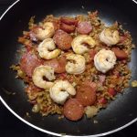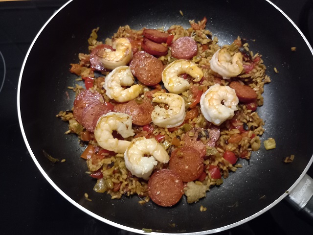 Voeg de garnalen en de chorizo toe aan de hapjespan met de rijst en groenten. Laat zachtjes koken tot de rijst helemaal gaar is.