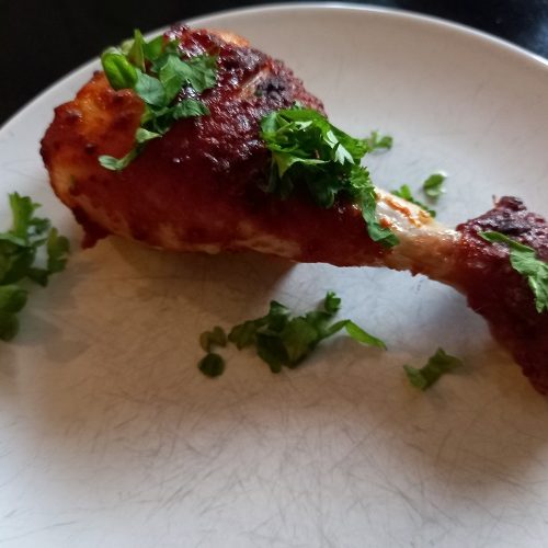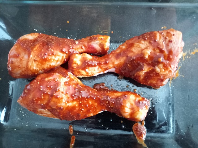 Smeer met behulp van een kwastje de saus over de drumsticks. Zet de schaal in de oven en bak gedurende 35-40 minuten. Zet de oven dan op de hoogste grillstand en grill nog 2 – 3 minuten.