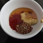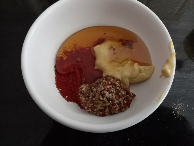 Meng in een schaaltje de 2 soorten mosterd, honing, paprikapoeder, knoflookpeder en uienpoeder tot een gladde saus.