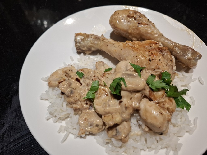 Zodra de champignons zacht en een mooi kleurtje hebben voeg dan de crème fraîche toe. Roer het geheel goed door en laat een paar minuten zachtjes koken zodat de saus wat indikt.