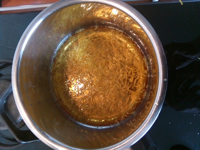 2. Breng 10 cl water aan de kook en los hier de suiker in op. Voeg de zestes toe en laat 20 minuten zachtjes koken. Snijd 4 ananas schijven in blokjes.
