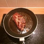 4. Snijd de eendenborst aan de velkant kruislings in. Bak de eendenborst 7 minuten op de velkant, draai dan om en bak nog een minuut of 5. Haal de eendenborst uit de pan en laat hem 10 min rusten onder aluminiumfolie.