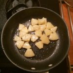 3. Verhit het klontje boter en de olijfolie in een koekenpan en bak de stukjes ananas. Keer regelmatig zodat de ananas een mooi kleurtje krijgt. Zet de wasemkap uit en flambeer de ananas met de rum. Voeg de zestes toe met 2 eetlepels van het vocht. Snijd de geschilde citroen door midden en knijp uit over de ananas. Meng dit alles goed door elkaar.