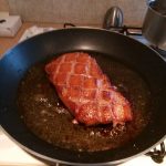 4. Haal de eend uit de pan en laat hem 5 minuten rusten op een bord onder aluminiumfolie.