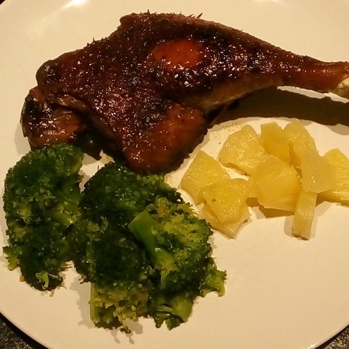 Leg de bout op een bord. Leg de stukjes ananas ernaast. Schep wat saus over de bout. Serveer met b.v. broccoli.