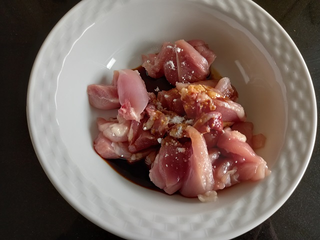 Doe de stukjes kip in een diep bord en giet de marina erover. Meng door elkaar. Zet voor minimaal 1 uur in de koelkast.