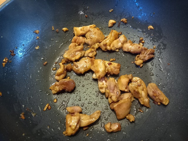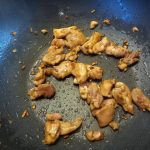 Voeg de kip toe en laat een paar minuten meebakken tot de kip een mooi kleurtje krijgt.