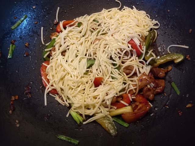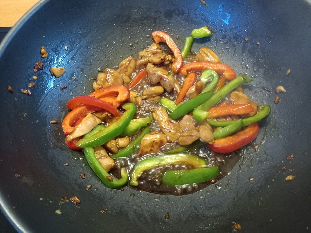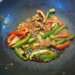 Voeg de paprikareepjes toe en bak tot deze een beetje zachter worden. Voeg dan de stukjes lente ui toe. Roerbak nog een paar minuten.